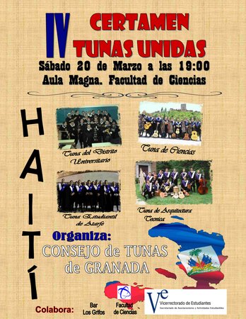 Esta sábado pasado tuvo lugar el IV Certamen "Tunas Unidas", a favor de las víctimas del terremoto en Haití. Se trata de un certamen con historia en la ciudad de Granada. Se inició como "Certamen Manos Unidas" hace muchos años, y ahora continúa la misma labor tratando de ayudar a la comunidad desfavorecida.