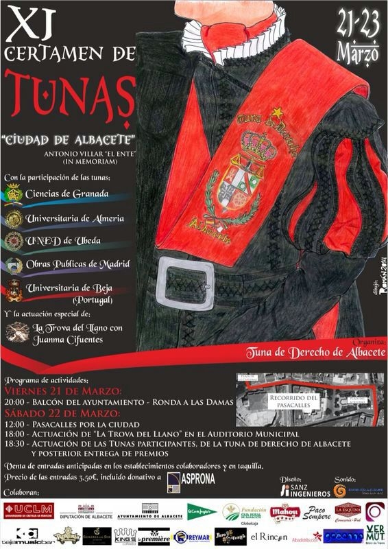El fin de semana del 21 al 23 de Marzo obtuvimos el Premio al Mejor Solista,junto con el Premio al Tuno Mas Sediento en el XI Certamen de Tunas "Ciudad de Albacete", organizado por la Tuna de Derecho de Albacete.